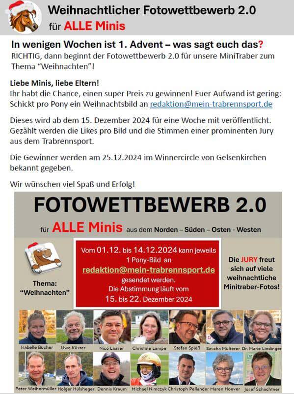 De fotowedstrijd begint op 1 december 2024, de eerste Adventsdag. Tot 14 december is het mogelijk om je foto in te sturen naar redaktion@mein-trabrennsport.de ! Vanaf 15 december worden alle inzendingen online geplaatst op de Facebookpagina van de minidravers in Duitsland (de link hiernaartoe wordt zo snel mogelijk gedeeld). De foto die de meeste likes krijgt én de meeste stemmen van de professionele jury wint de wedstrijd.